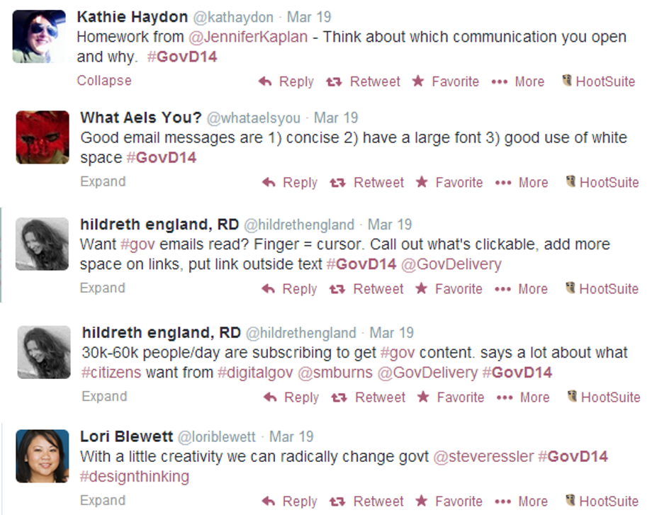 One of the best parts of the digital communications tour is the opportunity to listen to what other government communicators have to say about recent trends and what takeaways they find most important. Rather than synthesize those conversations into our own words, check out some of the snippets from Twitter during the last two tour stops and make sure to follow along with the hashtag: #GovD14.