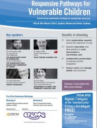 Care South, KARI Aboriginal Resources Incorporated, dSecretariat of National Aboriginal and Islander Child Care (SNAICC), Department of Family and Community Services, The Australian Childhood Foundation, Interrelate, Marymead, The Benevolent Society, Wesley Mission, Glastonbury Community Services Services, SDN Child and Family Services, Wanslea, Department of Human Services, Key Assets Fostering Western Australia, Baptcare, Anchor, Foresters Community Finance, UnitingCare Burnside, Challenge Children Services, The Salvation Army, Australia Eastern Territory, CREATE Foundation, Child Trauma Academy, The Queensland Child Protection Commission of InquiryThis event has no exhibitor/sponsor opportunities