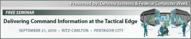 Attend the FREE hands-on training seminar “Delivering Command Information to the Tactical Edge,” on Tuesday and Wednesday, September 21-22, 2010 at the Ritz-Carlton, Pentagon City in Arlington, VA. We will bring together military program managers, application developers, and technology and information-sharing experts to discuss how to better deliver command information at the tactical edge.