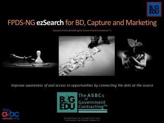 This workshop provides government contracting executives and professionals an introduction to and practical understanding of the ezSearch query and reporting functions of the Federal Procurement Data System - Next Generation (FPDS-NG). Participants are provided access to expertise, insights and resources they can use to attain the confidence, skills and knowledge to exploit FPDS-NG and Microsoft Excel in the practical application of making decisions related to marketing, business development, capture and bid proposal activities in government contracting.