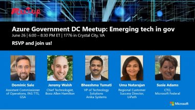 RSVP and join us to hear from innovators at the leading edge of emerging tech in government at the next Microsoft Azure Government DC meetup, Emerging tech in gov, on Wednesday, June 26.