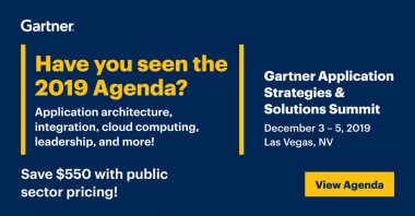 As a member of the public sector, you’re eligible for a special discount of $550 when you register for Gartner Application Strategies & Solution Summit 2019, December 3 – 5, in Las Vegas, NV. Plus, you’ll have access to case studies, networking with public-sector peers, one-on-one meetings with thought-leading industry experts and more.
