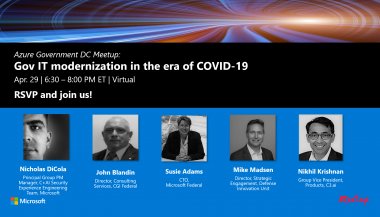 With this in mind, we invite you to RSVP and join us for our virtual Microsoft Azure Government DC meetup, Gov IT modernization in the era of COVID-19 Wednesday, April 29 from 6:30 to 8:00 p.m. EDT by joining: www.aka.ms/AzureGovMeetupLive