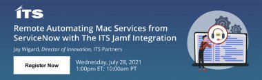 In this webinar, Jay Wigard from ITS Partners will work through a couple of stories to look at how the ITS Jamf Integration can leverage the Jamf Pro API in conjunction with Now Platform elements, like the employee Self Service portal and HR onboarding and off-boarding workflows, to operationally integrate Macs into the same IT process automation that gets applied to non-Mac users and assets.