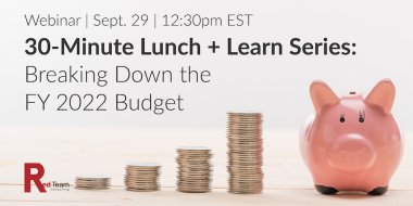 Red Team Consulting’s 30-Minute Lunch + Learn Series will provide attendees a bite-size session on varying topics to help your Federal contracting efforts. In this webinar, Tris Carpenter, Red Team’s Director of Capture, will be breaking down the FY22 Federal budget. Join us on Wednesday, September 29 from 12:30-1PM EST to get in-depth analysis on what the Federal government’s priorities are for the fiscal year.