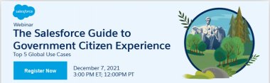 Register now and learn how Salesforce can help take a broad topic and bring it to action for your organization by discussing the top 5 use cases across global government. Whether you are considering chat bots, contact center modernization, self-service portals, email outreach, or digital forms, there is no way to get started.