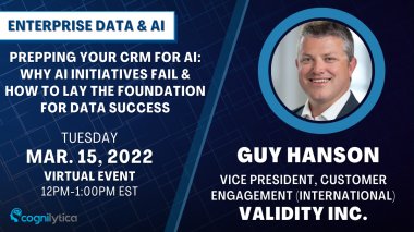 Enterprise Data & AI is hosting guest speaker Guy Hanson, Vice President, Customer Engagement (International) at Validity Inc. and his presentation "Prepping your CRM for AI: Why AI Initiatives Fail & How to Lay the Foundation for Data Success" Tuesday, March 15, 2022 at 12 PM - 1 PM ET!