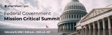 Please join us for the upcoming Smartsheet Federal Government Mission Critical Summit, a virtual event, taking place February 10, 2022 from 9:00 a.m. - 11:00 a.m. EST.