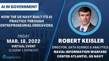 The March 2022 AI in Government featured presentation speaker is Robert Keisler, Director, Data Science & Analytics, Naval Information Warfare Center Atlantic, US Navy presenting ‘How the US Navy Built its AI Practice Through Entrepreneurial Endeavors’ on Friday, March 18, 2022 from 11:30 AM - 1 PM ET!