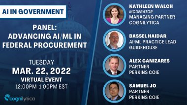 AI in Government is hosting the panel ‘Advancing AI/ML in Federal Procurement’ with moderator Kathleen Walch, Managing Partner and Principal Analyst at Cognilytica and panelists Alexander Canizares, Partner at Perkins Coie, Sameul Jo, Partner at Perkins Coie and Bassel Haidar, AI/ML Practice Lead at Guidehouse on Tuesday, March 22, 2022 from 12 PM - 1 PM ET!