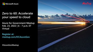 This month we invite you to RSVP and join the Azure Government user community on Wednesday, Feb. 23 from 6 – 7 p.m. ET, for a virtual meetup, “Zero to 60: Accelerate your speed to cloud,” where we’ll discuss and demo capabilities that can reduce your cloud implementation time from months to as little as one hour.