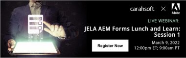 Adobe, Carahsoft, and Emergent are excited to invite current Adobe Joint Enterprise License Agreement (JELA) enrollees to the first session of our Adobe Experience Manager (AEM) Forms Lunch and Learn series.