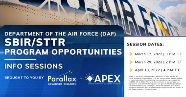APEX is thrilled to bring back our third round of SBIR/STTR info sessions this Spring! If you joined our sessions this past year, these upcoming dates will cover a great deal of similar content, but will also cover some program changes and growth from the most recent DAF solicitation.