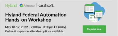 Join us for a two day, no cost automation workshop where attendees will have the opportunity to go 'hands-on" with Hyland experts. Let us know if you will be attending in person or online. The first 20 registrants will be able to attend in person, so sign up today.