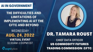The August 2022 AI in Government event featured guest speaker is Dr. Tamara Roust, Chief Data Officer at the US Commodity Futures Trading Commission and her presentation‘The Difficulties and Limitations of Implementing AI at the CFTC and Beyond’ Wednesday, August 24, 2022 from 11:30 AM - 1 PM ET!