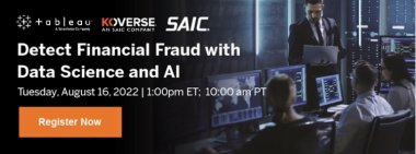 Amid the rise of financial fraud in the post-pandemic world, organizations need secure, scalable, and robust methods to mitigate risks. Using SAIC's Tenjin Artificial Intelligence (AI) Platform, the highly secure Koverse Data Platform, and Tableau, stakeholders can quickly and easily gain more accurate and informative insights from complex and disparate data sources. This use case will identify predictors of fraudulent transactions, which can then be used to support classifying new transactions.