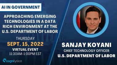 Join the September 2022 AI in Government event with featured guest speaker Sanjay Koyani, Chief Technology Officer at the Department of Labor and his presentation‘Approaching Emerging Technologies in a Data Rich Environment at the U.S. Department of Labor’ on Thursday, September 15, 2022 from 11:30 AM - 1 PM ET!