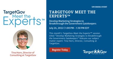 Join TargetGov’s Subject Matter Expert Tina Horn, Director, Consulting at TargetGov for “Develop Marketing Strategies to Breakthrough the Government Gatekeepers” webcast.