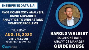 Enterprise Data & AI is excited to host Dr. Harold Walbert, Solutions Data Analytics Manager at Guidehouse and his presentation "Case Complexity Analysis: Using Advanced Analytics to Understand Complex Problems" on Thursday, August 18, 2022 from 12 PM - 1 PM ET!