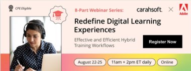 Join our eight-part webinar series running Monday, August 22nd through Thursday, August 25th, to learn how to create, manage, deliver, and track exceptional online training from start to finish. Adobe’s digital learning experts will explore how to create an all-in-one learning environment, design captivating content, manage content and learners, and increase the resonance of your message through a combination of engaging live virtual instruction and peer-driven, social learning experiences.