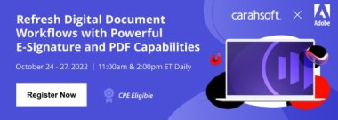View our eight-part on-demand webinar series to explore how you and your agency can utilize Adobe Document Cloud solutions to supercharge PDF experiences and electronic signature processes, with tools built for optimal security, compliance, and accessibility. Our team of Adobe Product Specialists take you on a tour of how to enhance digital document processes for a worry-free workflow.