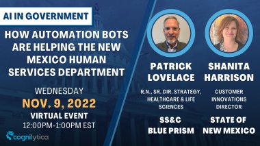 Join AI in Government with guest speakers Patrick Lovelace, R.N., Senior Director of Strategy, Healthcare and Life Sciences at SS&C Blue Prism and Shanita Harrison, Customer Innovations Director for the State of New Mexico presenting ‘How Automation Bots are Helping the New Mexico Human Services Department’ on Wednesday, November 9, 2022 from 12 PM - 1 PM ET!