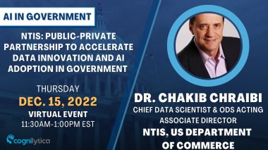 Join the December 2022 AI in Government event with featured guest speaker Dr. Chakib Chraibi, Chief Data Scientist and Office of Data Services Acting Associate Director at the NTIS, U.S. Department of Commerce and his presentation‘NTIS: Public-Private Partnership to Accelerate Data Innovation and AI Adoption in Government’ on Thursday, December 15, 2022 from 11:30 AM - 1 PM ET!