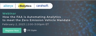 Attendees joined this On-Demand webinar to see how the FAA worked with eSolytics and Alteryx to build an automated process that pulls data from its GSA Fleet, Property data and DELPHI feeding into a centralized database. Users across the agency can now quickly generate both standardized reports, custom reports, geospatial analysis, and dashboards that give an up-to-date view of the fleet status at individual, regional, and national levels and position the agency to meet the guidelines of the ZEV mandate.