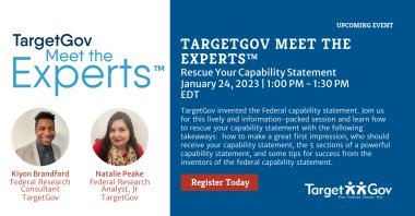 This month’s TargetGov Meet the Experts™ session is “Rescue Your Capability Statement” we will be joined by our subject matter experts Kiyon Brandford, Federal Research Consultant and Natalie Peake, Federal Research Analyst, Jr with TargetGov.