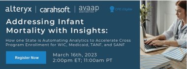 Join this on-demand webinar to see how using the Alteryx analytics platform and integrated capabilities such as Fuzzy Matching, local WIC agencies could identify and proactively outreach to candidates who most likely qualified for WIC benefits providing additional nutritional support so critical to invitro and early childhood health.