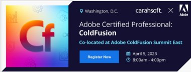 Become an official Adobe Certified Professional at the ColdFusion Summit East - an industry-leading certification program from Adobe for ColdFusion developers. It is designed for professionals with basic to advanced-level proficiency in any computer language and web development.
