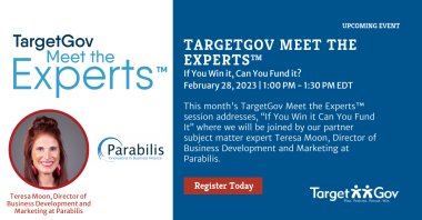 This month’s complimentary TargetGov Meet the Experts™ session is “If You Win it, Can You Fund It?” we will be joined by our partner subject matter expert Teresa Moon, Director of Business Development and Marketing at Parabilis.