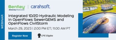 Join us on March 29th for a complimentary webinar on Integrated 1D/2D Hydraulic Modeling in OpenFlows SewerGEMS and OpenFlows CivilStorm, for an introduction to the Bentley OpenFlows™ SewerGEMS® wastewater and stormwater engineering planning software platform.