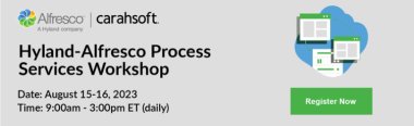 Join us on August 15-16 for a for a two-day, no cost Alfresco Process Services in-person workshop where you will receive hands-on experience with Hyland experts.