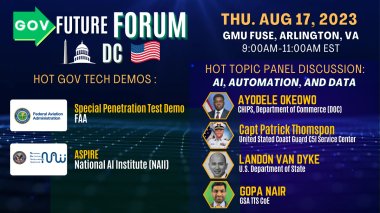 GovFuture Forum is a monthly demo and panel event where government innovators, technologists, thought leaders, movers-and-shakers, government ecosystem partners, and interested people see showcases on cool new technology in a demo format, learn from innovators in high-value panels, and interact with each other.