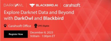 Join us at the Carahcafe for a Hands-on-Lab and complimentary breakfast as we explore darknet data in DarkOwl’s Vision UI platform. Attendees will then view the darknet data in real-time in Blackbird’s Constellation Dashboard to see a complete picture of impactful intelligence.