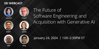 In this webcast, Software Engineering Institute (SEI) researchers will explore the future of software engineering and acquisition using generative AI technologies. They’ll examine current applications, envision future possibilities, identify research gaps, and discuss the critical skill sets that software engineers and stakeholders need to effectively and responsibly harness generative AI’s potential. Fostering a deeper understanding of AI’s role in software engineering and acquisition accentuates its potential and mitigates its risks.