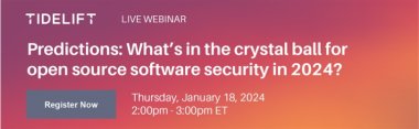 As we approach 2024, Tidelift continues its tradition of insightful predictions on open source software security. Join us on January 18, 2024 at 2:00pm ET, for a discussion featuring Tidelift's co-founders Donald Fischer and Luis Villa, RedMonk analyst Kelly Fitzpatrick, and npm maintainer Jordan Harband.