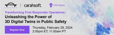 Watch this on-demand webinar to learn how these models can be used for forensic scene capture and documentation, accident reconstruction, disaster and emergency preparedness exercises, training and post-mortem reviews, pre-plans for fire marshal inspections, digital sharing and collaboration, 911 dispatch information, and other use cases.