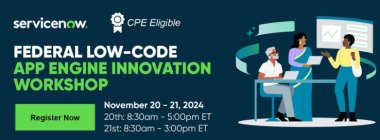 Join us in-person for a full day hands-on Low-Code App Engine Innovation Workshop to see how organizations are re-imagining their approach to automation and app development with ServiceNow's Creator Workflows. Learn how to boost productivity at scale by building high-value low-code mission apps with App Engine. Whether you're a pro developer of any level looking to streamline repetitive tasks, a low-code business analyst looking for ways to solve unique mission challenges, an architect ready to drive the next phase of innovation, or a business leader seeking the right automation solutions, this low-code hands-on workshop is for you!