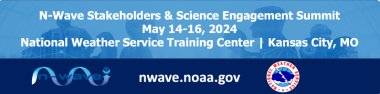 Save the date and join us in May for the annual N-Wave Stakeholders and Science Engagement Summit. This in-person (with limited live streaming) three-day event is a gathering of N-Wave stakeholders from across NOAA Line Offices, DOC Bureaus, other federal agencies, along with partners from the science, research and education networking community. The summit is scheduled for May 14-16, 2024, and will be held at the National Weather Service Training Center in Kansas City, Missouri. The event is scheduled to run from 9:00 a.m. - 4:00 p.m. CDT each day.