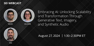 In an era where digital transformation is paramount, the potential of generative artificial intelligence (AI) extends far beyond automation. In this webcast, Tyler Brooks, Shannon Gallagher, and Dominic Ross aim to demystify AI and illustrate its transformative power in achieving scalability, adapting to changing landscapes, and driving digital innovation. The speakers delve into the practical applications of generative text, imagery, and synthetic audio, showcasing how these technologies can revolutionize various workflows.