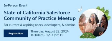 Hello Salesforce Trailblazers! You are invited to join our State of CA Salesforce Meetup. Whether you're a Salesforce pro or just getting started, this in-person event will provide you the opportunity to connect with your state peers and: