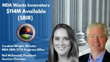 Join GovCon Chamber president Neil McDonnell in a fireside chat with Candace Wright, Director of the SBIR / STTR Program Office for the Missile Defense Agency (MDA).