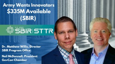 Join GovCon Chamber president Neil McDonnell in a fireside chat with Matthew Willis, Ph.D., Director of the SBIR|STTR Program Office for the Department of Army and a champion for small business innovation.