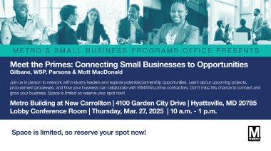 Join us in person to network with industry leaders and explore potential partnership opportunities. Learn about upcoming projects, procurement processes, and how your business can collaborate with WMATA’s prime contractors. Don’t miss this chance to connect and grow your business. Space is limited so reserve your spot now!