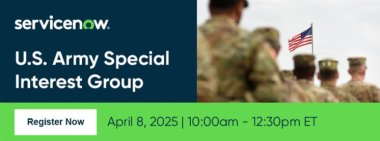 Join ServiceNow and your peers for the U.S. Army Special Interest Group hosted by the ServiceNow Army Team on April 8th. In this session, you'll get to hear your peers share their journey with ServiceNow to address mission outcomes. In addition, you’ll get to hear about the latest innovation on the NOW platform.