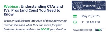 The GovCon landscape is changing quickly and partnering opportunities are more important than ever for sustainment and growth. What are MSA CTAs and how do they work? Is a Joint-Venture an alternative to seriously consider? What the difference between a MSA CTA, JV and Subcontract? Join us for our Understanding CTAs and JVs: Pros (and Cons) You Need to Know webinar for critical insights into each of these partnering relationships and what they can mean for your business!