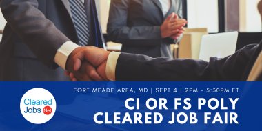 Security cleared professionals please join us for the CI or FS Poly Cleared Job Fair, Thursday, September 4, from 2pm – 5.30pm at The Hotel at Arundel Preserve in Hanover, Maryland.