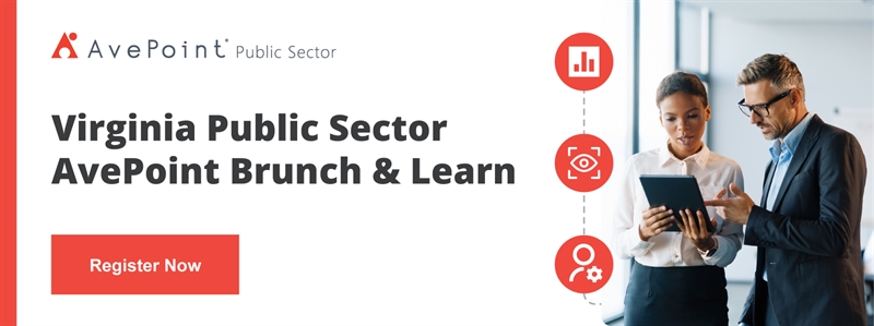 You’re invited to our Virginia Public Sector AvePoint Brunch & Learn, which will be held in-person in Richmond, VA (or online via Teams) on Tuesday, April 28, 2026. This session will bring together IT leaders and Microsoft, Google and Salesforce administrators in Virginia to discuss current projects, challenges and innovations.